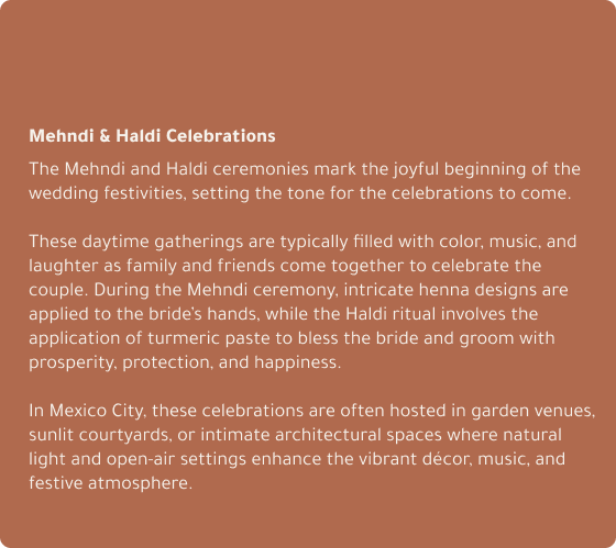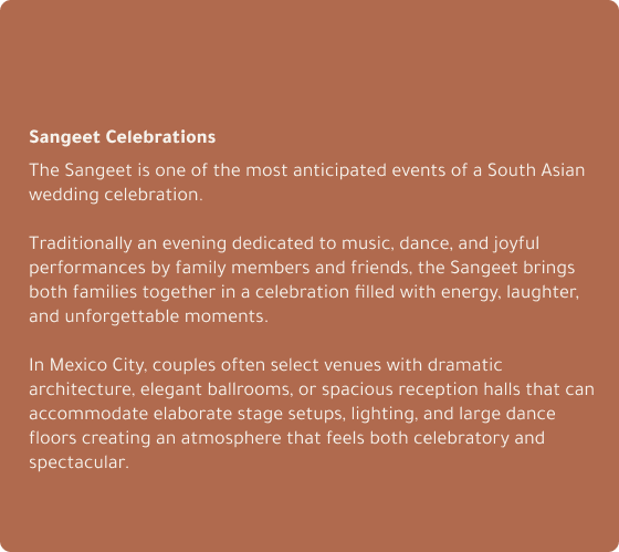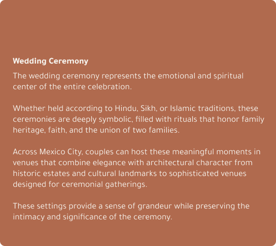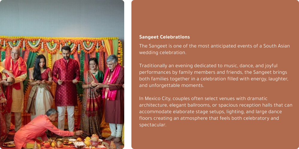 South Asian weddings often unfold over several days, with each event carrying its own cultural significance. Mexico City provides the variety of spaces needed to host these celebrations: garden venues for daytime ceremonies, historic estates for traditional rituals, and expansive venues ideal for lively Sangeet nights and grand receptions.