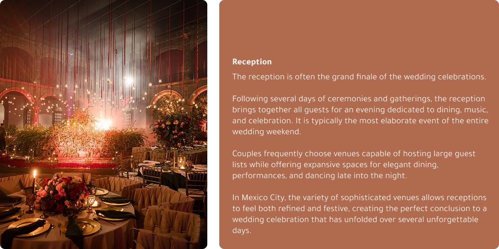 Few cities offer the diversity of venues found in Mexico City. Couples can celebrate each wedding event in a different setting from historic convents and colonial mansions to grand reception halls, contemporary architectural venues, and refined hotels. This flexibility allows every celebration, from an intimate Haldi ceremony to a large reception, to have its own atmosphere and visual identity.